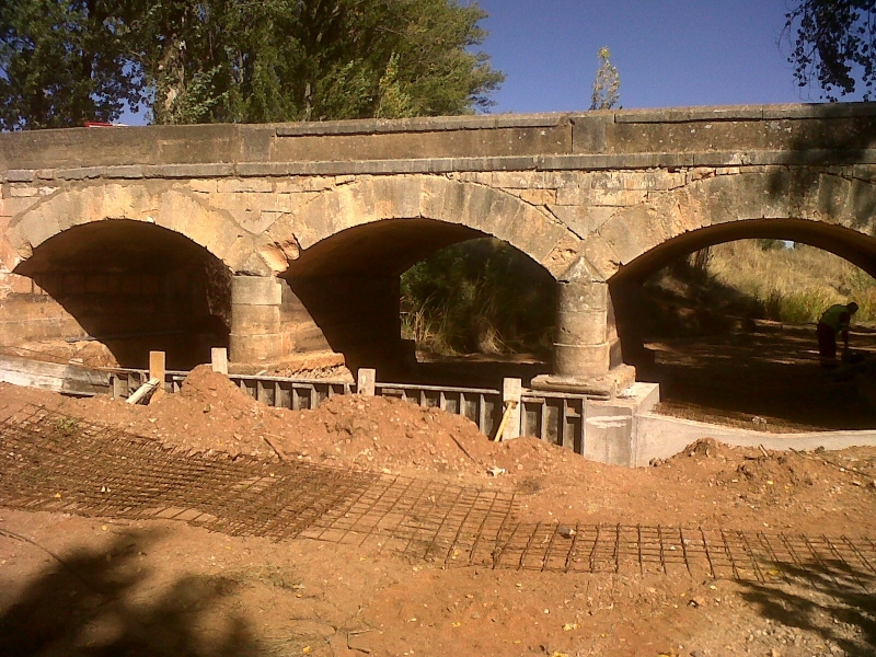 La cimentación de unos de los ojos del puente se encontraba prácticamente al aire, por lo que se ha protegido mediante un muro de hormigón armado de 30 centímetros de espesor. Posteriormente se ha hormigonado la solera de los tres ojos, ejecutándose tanto aguas arriba como aguas abajo un rastrillo para impedir, en la medida de lo posible, nuevas erosiones en la solera.
